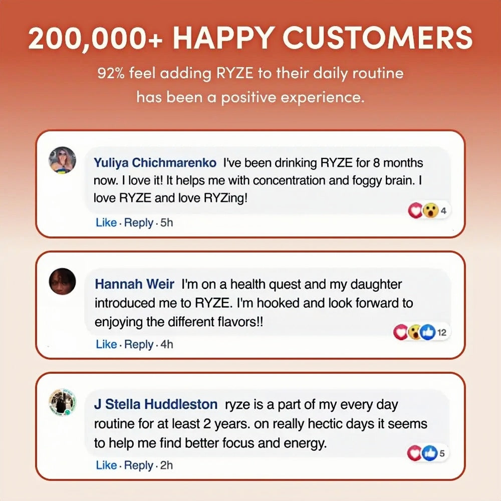 We may be biased because we like to drink RYZE all day long. However, we recommend it first thing in the morning to get your energy levels up, your focus turned ON, and your happiness at an all time high. It's the perfect way to start the day. It also works amazing as an afternoon-pick-me-up. Not at all harsh like coffee, its calm energy takes you smoothly right into the evening hours.